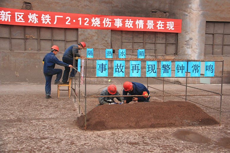 本网讯(记者 王鹏征)6月22日,新区炼铁厂焊工烧伤事故情景再现演练在3#、4#烧结车间东侧举行。该厂员工用生动的表演,再现了2014年发生的一起焊工烧伤事故的全过程,使现场人员受到了深刻教育。曲沃县安监局局长陈勇,公司副总经理武建伟等现场观看了演练。