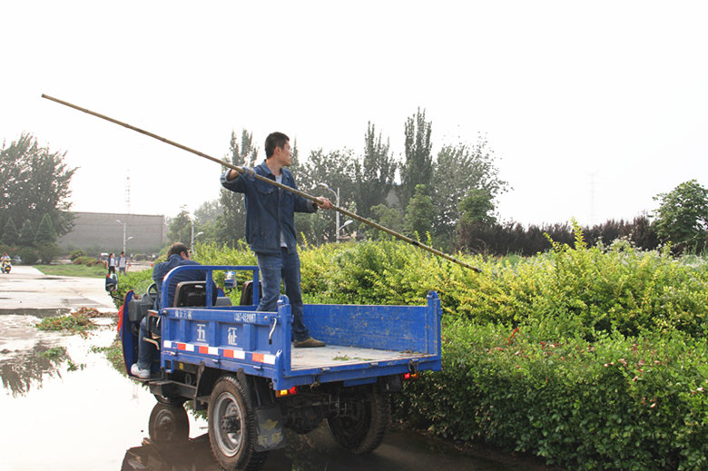 记者在现场看到,由于昨天晚上刚刚下过大雨,地面低洼处还存留许多积水,绿化带内的泥土也十分松软。负责拔草的员工没走几步路,鞋上已经沾满湿泥,但大家毫无怨言,俯身在绿化带内,或用手拔,或用铁锹铲,将一丛丛杂草清理到路旁,然后用三轮车拉走。看到绿化带的冬青、松柏上爬满杂乱的藤蔓,员工们有的站在三轮车上用耙子往外拽,有的干脆钻进半人高的苗木丛中,用手一把一把地撕扯着。苗木上残留的雨水,随着藤蔓扯动“哗哗”流下来,还没干几下,大家的鞋子和裤子就已湿透了,但没有一人停歇。