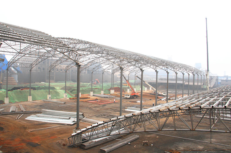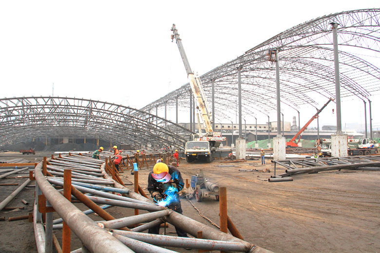 记者看到,20多道已制作完成的钢梁整齐摆放在施工现场内,在不远处的吊装现场,大型吊车刚刚把一道钢梁吊装到立柱顶部,然后在高空进行对接。据介绍,按照设计方案,立恒炼铁厂全封闭料场的顶棚共需要51道拱形钢梁。目前,已焊接制作了30多道钢梁,吊装到位的钢梁也有10余道,总体施工进度已完成60%左右。