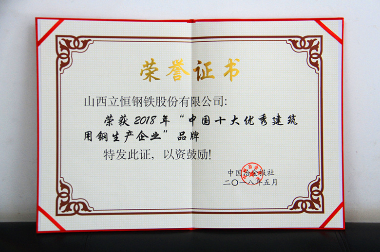 前不久,由中国冶金报社发布的中国钢铁企业品牌排行榜中,公司被授予2018年度“中国十大优秀建筑用钢生产企业”品牌,这是权威媒体对立恒钢铁品牌的认可与肯定。