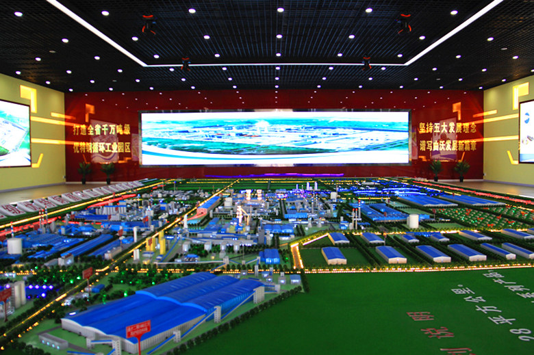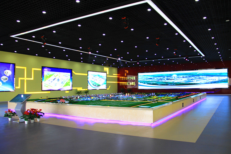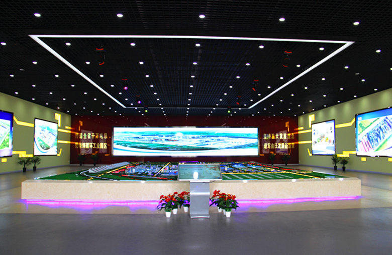 该展厅由公司投资建设,占地面积约3600平方米,建筑面积1200平方米,内部设计新颖大方,由沙盘、摇头灯、多媒体视频、墙体灯箱等组成,全方位展示了立恒集团及工业园区的区位优势、产业布局和未来规划,直观地反映了园区企业的发展现状。