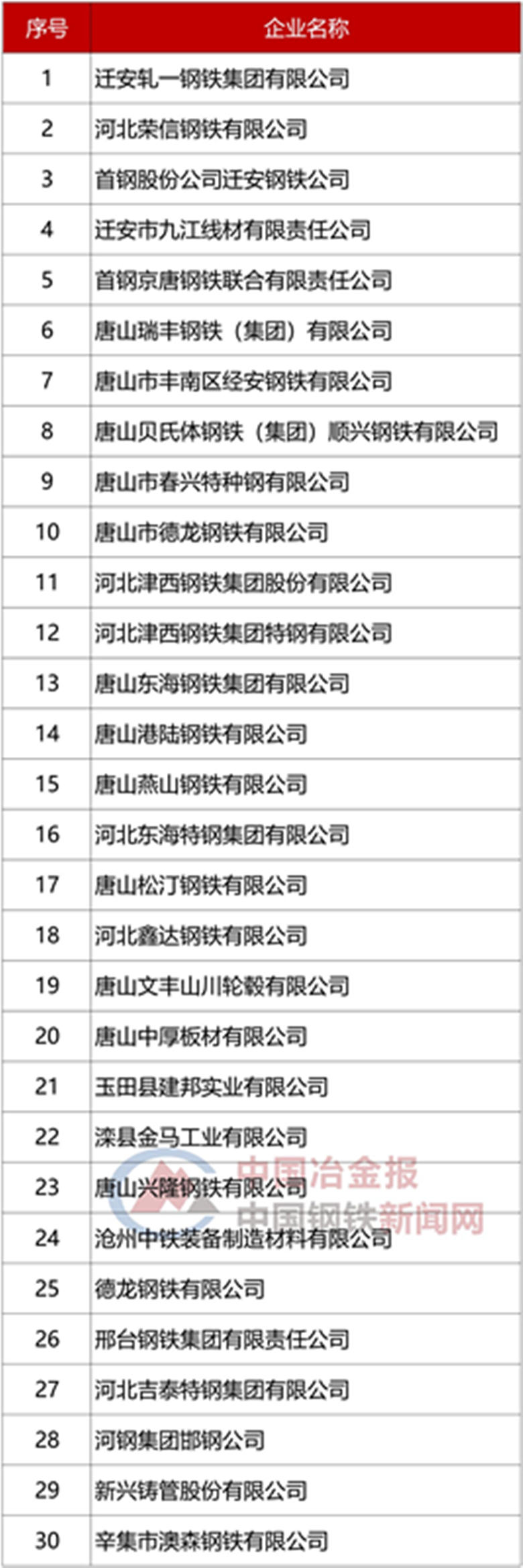 近日,河北省生态环境厅发布河北省2019年度开展强制性清洁生产审核企业名单(以下简称“名单”),对钢铁、焦化等企业围绕蓝天保卫战三年行动方案提出的实施大气污染物超低排放要求,对照清洁生产国际先进水平实施清洁生产审核。据《中国冶金报》、中国钢铁新闻网统计,名单中包含的钢铁企业共有30家,具体如下——