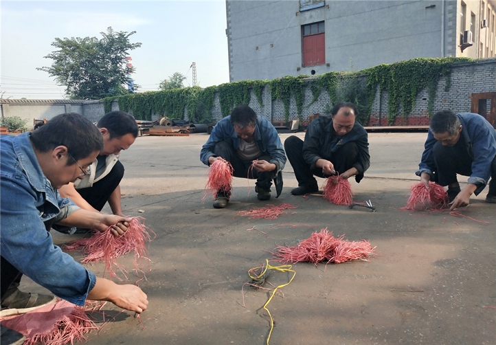 工艺主管周志敏组织下班员工义务绑制扫帚。他们先将编织袋裁剪成适当的尺寸,然后再一丝一丝的抽拆,用铁丝绑成一簇一簇的“毛毛绒”,利用编织袋将废旧扫帚包起,最后把已备好的材料“毛毛绒”固定在上面,一把称手的清扫工具就制作完成。自制毛毛扫帚不仅节约成本,而且经久耐用,既扫的干净,又用的称心。