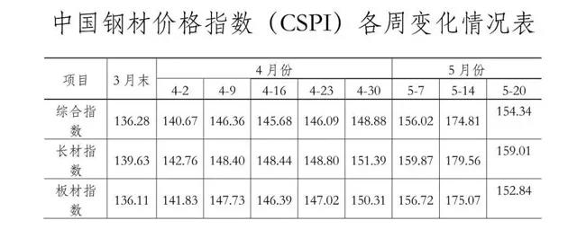 据中国钢铁工业协会(以下简称“中钢协”)监测,从今年年初到5月中旬,国内钢材价格走出了一波上涨行情。截至今年5月14日,国内钢材综合价格指数(CSPI)报174.81点,较去年年末上涨40.4%;长材价格指数报179.56点,较去年年末上涨42.2%;板材价格指数175.07点,较去年年末上涨38.7%,已达10余年历史高点。