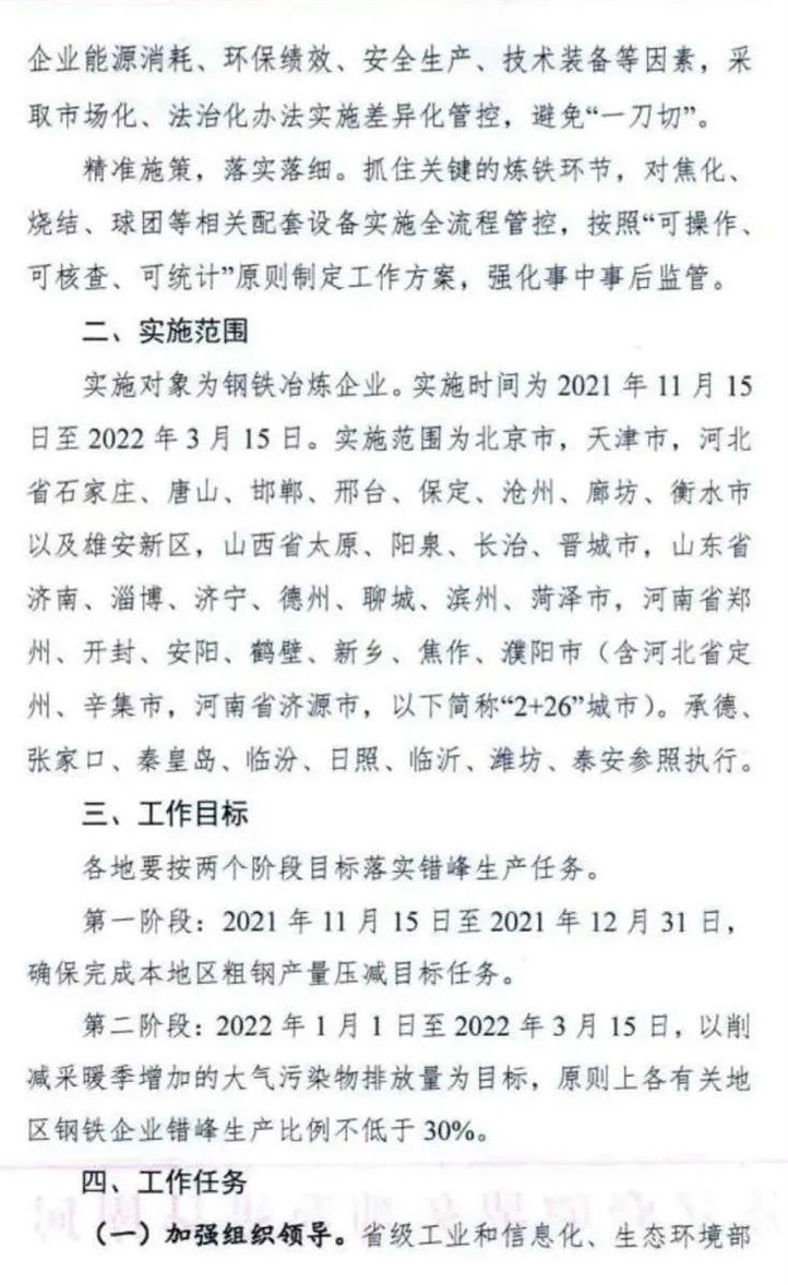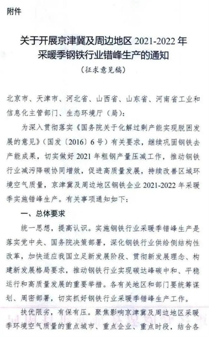 9月2日,工业和信息化部、生态环境部发布《关于开展京津冀及周边地区2021-2022年采暖季钢铁行业错峰限产的通知》(征求意见稿)(以下简称《限产通知》)。根据该《限产通知》,基本确定了今年重点地区及周边地区的限产方案,备受关注的粗钢产量压减方案也在该文件中有重要体现。