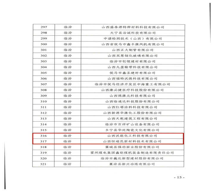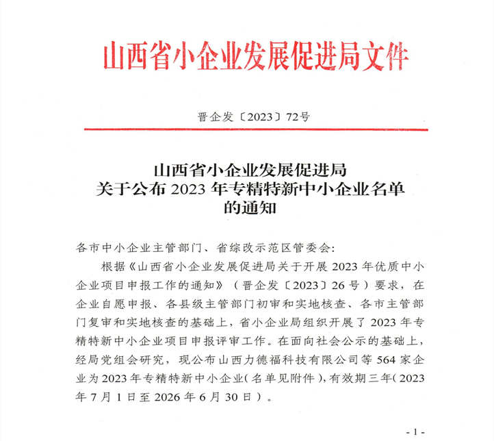 7月25日,山西省小企业发展促进局下发《关于公布2023年专精特新中小企业名单的通知》,山西沃能化工科技有限公司、山西恒瑞昆新材料技术有限公司被认定“2023年专精特新中小企业”。依据相关规定,“专精特新”企业将在技改融资、税收减免、政策扶持、品牌提升等方面享受国家政策支持。