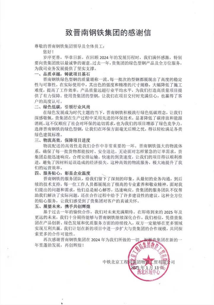 1月13日,集团收到来自中铁北京工程局集团物资工贸有限公司西北区域中心向集团发来感谢信。信中高度赞扬了集团绿色型钢卓越品质、高效物流配送服务,以及提供的全方位贴心服务,对集团给予的支持表达了诚挚的感激之情。